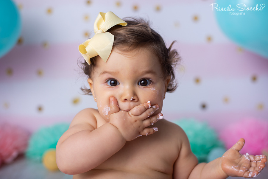 - Chegou o grande momento: hora da meleca! Vamos colocar o bolo/frutas e, à partir daí, o bebê comanda a bagunça.