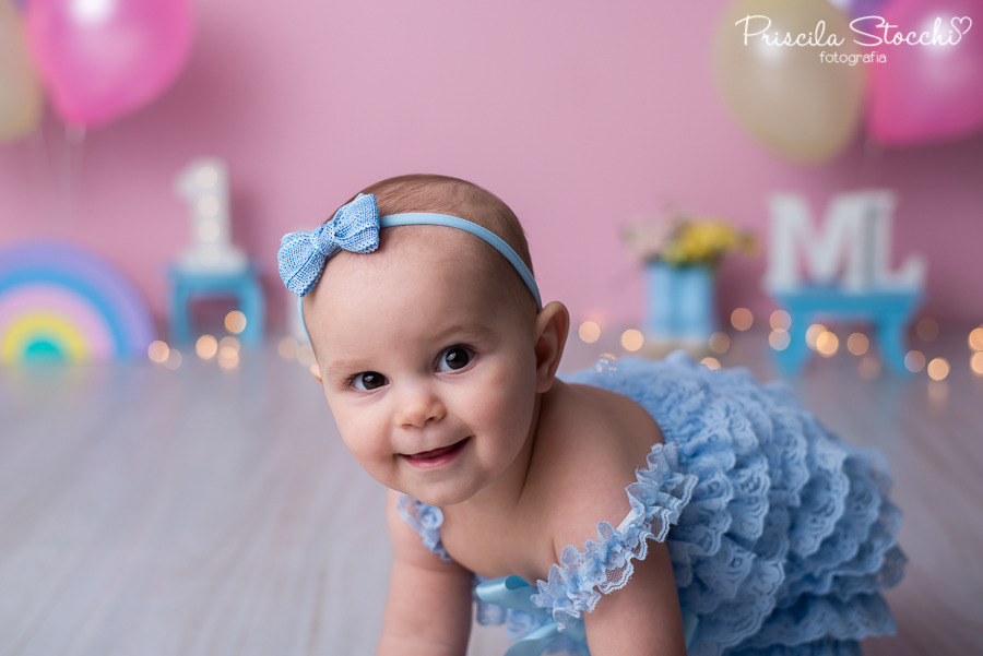 - Em seguida faremos algumas fotos do bebê sozinho no cenário, ainda sem o bolo/frutas.